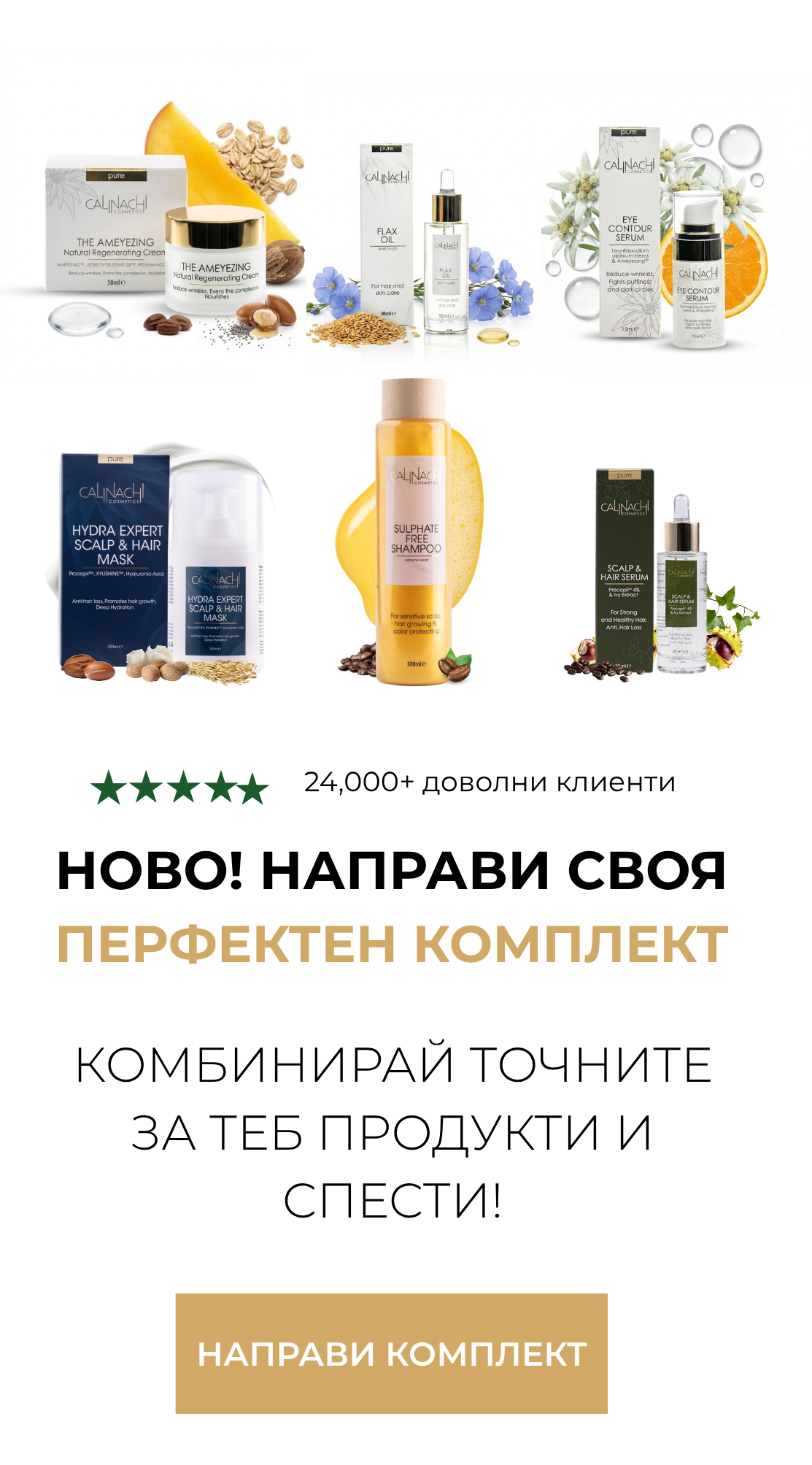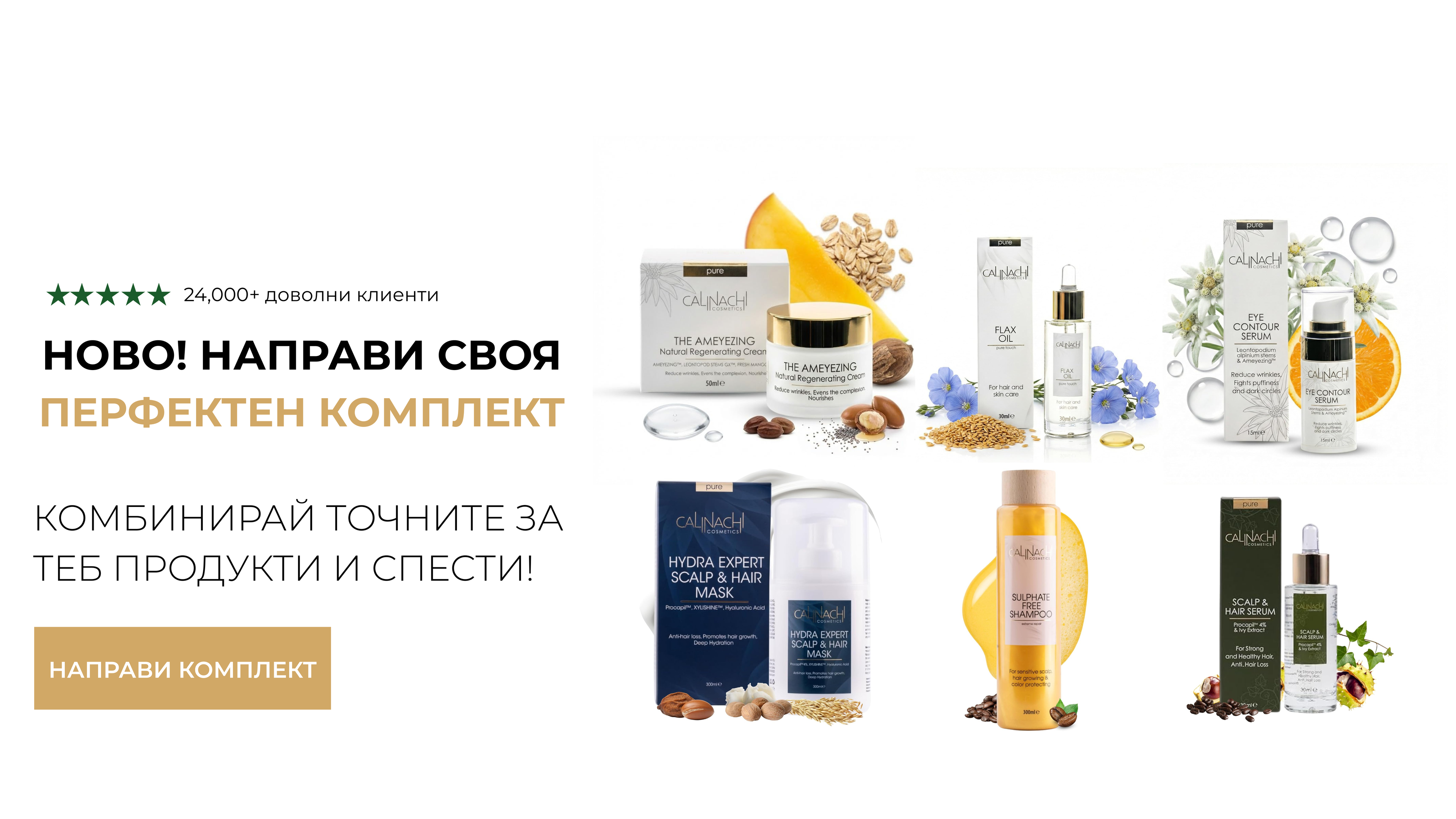 "Ние създаваме формули, при които науката осигурява прецизност, а природата носи баланс. С активни съставки от водещи лаборатории във Франция, Италия, Швейцария и Обединеното кралство, комбинирани с внимателно подбрани растителни екстракти и масла, CALINACHI предлага първокласна грижа за косата, скалпа и кожата — с реални, дълготрайни резултати."